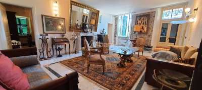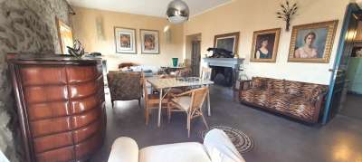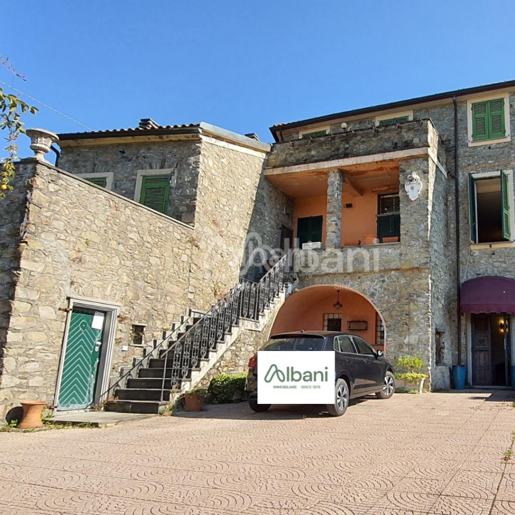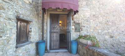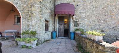 La porzione di fabbricato in vendita, con le facciate interamente in pietra, misura una metratura complessiva di mq 400 circa, distribuiti tra l´abitazione principale, sviluppata su 3 livelli e cantine, ed il fabbricato adiacente, utilizzabile come dependance dotata di terrazza abitabile. Al piano terra si trova ampio vano disimpegno, soggiorno con camino, cucina abitabile, un servizio. Dalla cucina si accede agli ampi due vani uso cantina, seminterrati. L´importante scala in ardesia sale al piano superiore ove si trova l´area conviviale dell´abitazione, con il salone con antico camino, una camera, uno studio, un vano di servizio ed il bagno al piano, oltre a terrazza panoramica dalla quale è possibile ammirare uno scenario sconfinato fino al mare. L´ultimo piano è riservato alla zona notte padronale con l´ampia stanza da letto, molto suggestiva, dotata anch´essa di camino, spogliatoio e terrazza, altra camera da letto ed una sala da bagno, veramente unica per la presenza di materiali pregiati utilizzati nella ristrutturazione. La dimora è stata restaurata dagli attuali proprietari nel rispetto delle unicità architettoniche del fabbricato, con il recupero degli elementi di pregio originali e l´inserimento di nuovi materiali come le ceramiche, i mosaici in vetro di murano e tanto altro.