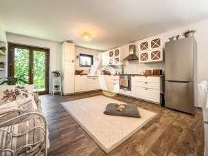 Al piano terra troviamo in taverna la zona giorno open space con cucina e sala da pranzo, un salotto separato e bagno con doccia.