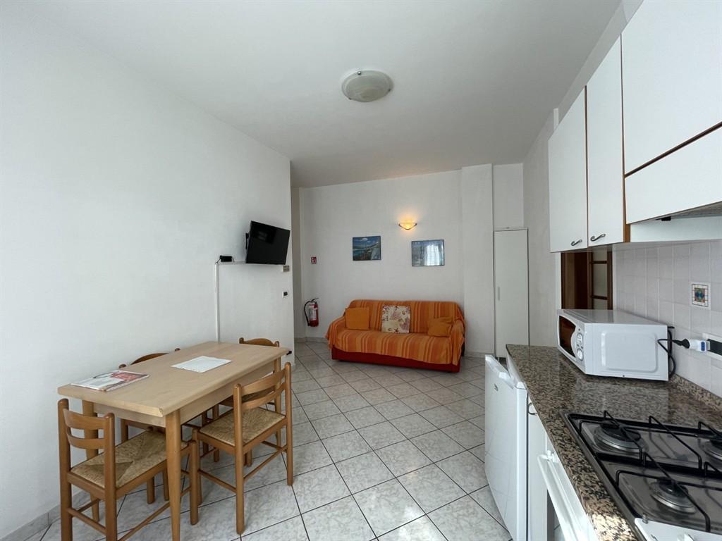 L´appartamento è composto da un luminoso soggiorno con cucina a vista, dotato di un comodo divano letto, e da una camera da letto con letto matrimoniale. Il bagno, finestrato, è dotato di doccia e pratico antibagno. Completa la proprietà un balcone, dove è possibile mangiare all´aperto.