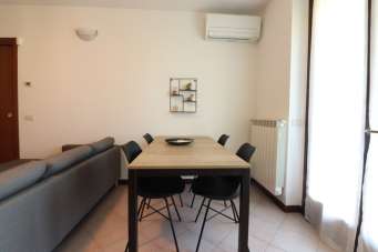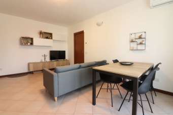 L´appartamento è sito al secondo piano servito da ascensore; l´ingresso è diretto nella zona giorno suddivisa in zona Tv, zona pranzo e cucina a vista, con accesso al terrazzino, attrezzato di tende da sole motorizzate che volge a sud garantendo luminosità all´ ambiente. Il disimpegno è attrezzato con un armadio a muro su misura che funge da ripostiglio, un bagno con box doccia e una camera matrimoniale ampia con accesso al terrazzino. L´appartamento è stato arredato completamente con mobili moderni di ottima qualità, un gusto moderno e deciso che caratterizza la casa. La cucina è dotata di tutti gli elettrodomestici (lavastoviglie, forno, microonde da incasso in colonna, frigorifero e piano cottura)