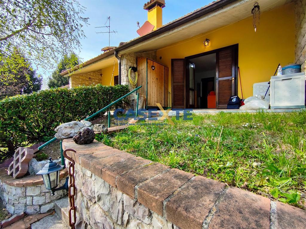 Si PROPONE: Bilocale in villetta posto al piano terra rialzato, gode di una fantastica terrazza/giardino sempre soleggiata, all´interno è composto: soggiorno con cucina a vista e termo camino, disimp. , camera matrimoniale con altro terrazzo sul retro e bagno completo di tutto.