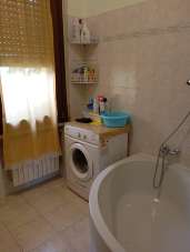 A sinistra troviamo il bagno lavanderia finestrato con affaccio all´interno del cortile, con vasca, i sanitari e la postazione della lavatrice.