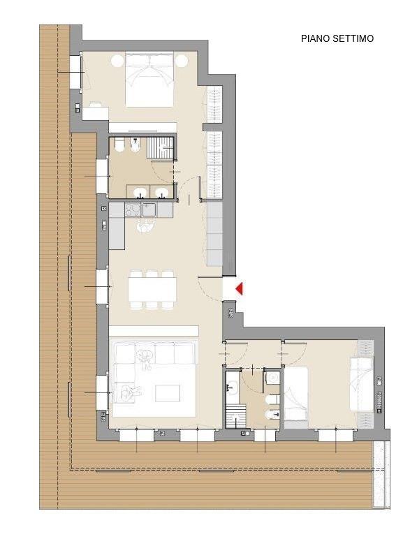 L´appartamento è composto da ingresso su affascinate zona living con cucina a vista, due camere da letto, ampio disimpegno e doppi servizi, entrambi finestrati. Caratterizza l´appartamento l´ampio terrazzo accessibile da tutti gli ambienti con vista su tutta Milano.