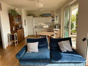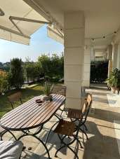 La distribuzione è razionale e vivibile: ingresso su soggiorno con cucina a vista, in continuità con il lastricato e il giardino sud, ideale per pranzi all’aperto e relax; disimpegno verso la zona notte con due camere affacciate sul giardino nord, perfette per luce morbida e temperature più fresche; bagno finestrato con doccia walk in; lavanderia. Impianti di ultima generazione: riscaldamento autonomo a pavimento per un clima uniforme, aria condizionata, isolamento termo acustico evoluto. Stabile privo di barriere architettoniche, con ascensore che serve anche cantine e autorimesse.