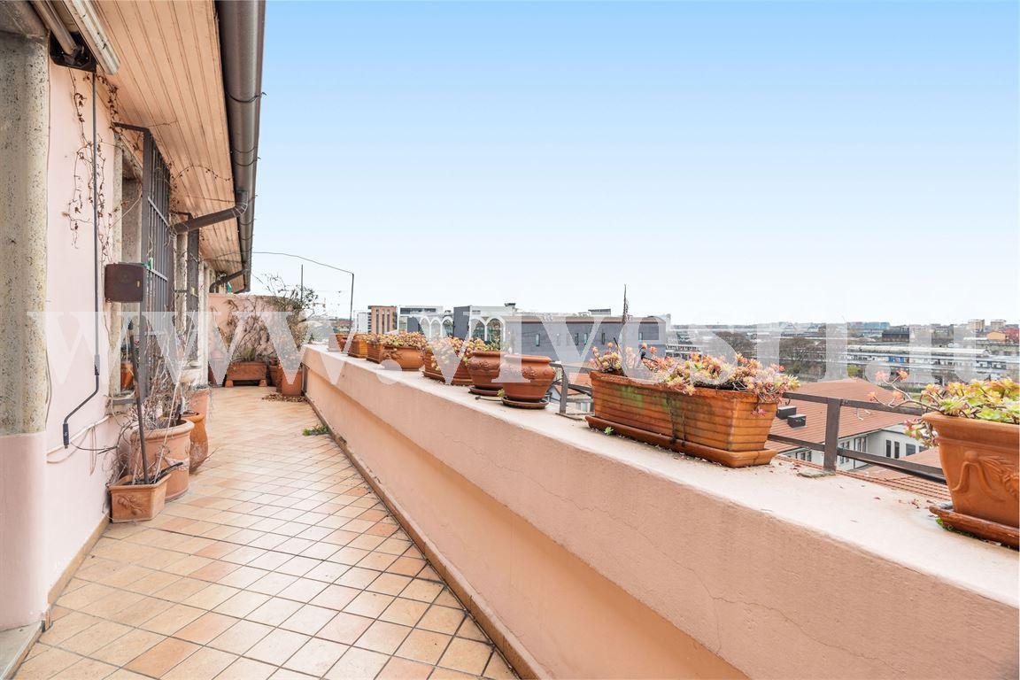 Proponiamo in vendita luminosissimo e silenzioso attico di mq 88 ca. con terrazzo, posto al sesto ed ultimo piano composto da ingresso, grande cucina abitabile con zona pranzo ed ampio soggiorno entrambi affacciati sul terrazzo, camera da letto matrimoniale molto comoda con angolo studio, due bagni con finestra e cantina. Possibilità di ricavare una seconda camera da letto. Lo stabile degli anni ´40, è dotato di ascensore. La zona residenziale è ben servita, vicina a supermercati e mezzi di trasporto in superfice e vicino alla MM linea blu. Richiesta € 615.000. APE: F - KWh/m2a 230,83