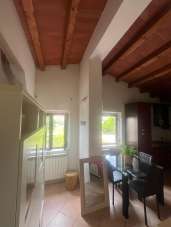 L’immobile si apre su un accogliente ingresso che conduce alla zona giorno open space, con soggiorno e angolo cottura caratterizzati da suggestive travi in legno a vista. Un comodo disimpegno introduce la camera matrimoniale, spaziosa e ben illuminata, e il bagno finestrato con doccia.