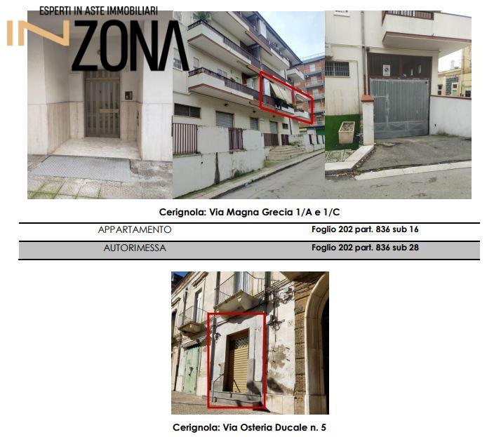 ASTA --- PREZZO 43.728,00 and euro; --- RISPARMIO and euro;98.000\nper la quota di piena proprietà (1/1) composto da:\nAppartamento per civile abitazione a piano primo sito in Cerignola (FG), via Magna Grecia 1/A.\nIn catasto fabbricati del medesimo Comune al Foglio 202, particella 836, Sub 16, cat. A/2, classe 2, piano primo, consistenza 6 vani, superf. catast. 117 escluse aree esterne, con aree esterne 123 mq, rendita catastale and euro; 619,75.\n\nBox sito in Cerignola (FG), via Magna Grecia 1/C, piano seminterrato.\nIn catasto fabbricati del medesimo Comune al Foglio 202, particella 836, Sub 28, cat. C/6, classe 7, piano seminterrato, consistenza 24 mq, superf. catast. 25 mq, rendita catastale and euro; 75,61.\n\nData di vendita\n11/12/2025 18:00\n\nPrezzo base d´asta\n58.304,00 and euro;\nOfferta minima\n43.728,00 and euro;\n\nTi piacerebbe comprare una casa all´asta ma non sai come fare perché non sei un esperto?\n\nContattaci per avere maggiori informazioni su questo immobile e su come poterlo acquistare in totale sicurezza.\n\nINZONA offre un servizio di ASSISTENZA TECNICO - LEGALE per l´acquisto di immobili in asta attraverso queste attività:\n\nPRIMA CONSULENZA: Appuntamento presso la nostra sede di Foggia, presso il Centro direzionale E9 in Via Donato De Leonardis, 2 - 71121 Foggia (FG), per offrire chiarimenti sulle aste ed ascoltare le tue esigenze immobiliari.\n- Mediazione creditizia\n- studio fattibilità per la partecipazione in asta con mutuo fino al 100%\n- Studio della perizia e della documentazione dell´immobile\n- Accertamenti catastali per eventuali abusi edilizi\n- Accompagnamento Visita Immobile\n- Disbrigo pratiche per la partecipazione all´asta (anche solo compilazione della domanda)\n- Rappresentanza Legale il giorno della vendita\n- Rilascio del decreto di trasferimento in tempi brevi\n- Assistenza per il Saldo Prezzo\n- Compilazione F24 per Tasse\n- Disbrigo Pratiche per Eventuale Sanatoria\n- Assistenza alla Consegna Immobile\n\nContattaci per avere maggiori informazioni sull´immobile e su come partecipare all´asta.\n\n\n