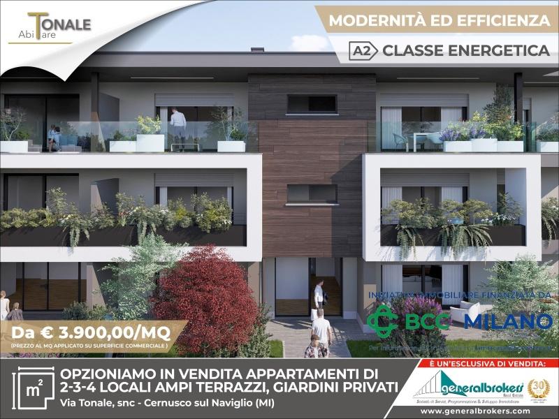 A Cernusco sul Naviglio in Via TONALE n. 7 nasce un nuovo complesso residenziale denominato ´´ABITARE TONALE´´.\nIn moderno ed elegante contesto di 13 unità abitative, PRENOTIAMO TRILOCALE al piano terra di 134 mq.\n\nL´immobile è composto da: ingresso, ampio soggiorno, cucina abitabile, disimpegno, due camere da letto, due bagni, portico di 38 mq e giardino di 245 mq.\nImpianto climatizzazione centralizzato e riscaldamento centralizzato a pavimento con contabilizzatore autonomo.\nEsposizione est-nord - sud.\nValore di progetto: classe energetica A2.\n\nMateriali e rifiniture di alto standard qualitativo con impiego di energie rinnovabili con la finalità di raggiungere il miglior risparmio energetico e confort abitativo.\nPossibilità di personalizzazione ambienti interni con supporto tecnico da parte del costruttore.\n\npossibilità di box singoli o doppi\nConsegna prevista: Luglio 2026\nPrezzo richiesto: ? 522.000,00 escluso box.\n\nNel presente annuncio sono state utilizzate immagini di repertorio non vincolanti.\nPer visione del progetto e/o ulteriori informazioni potete contattarci. - Maggiori Dettagli: Climatizzato, predisposizione antifurto, Cucina Abitabile, Porta blindata