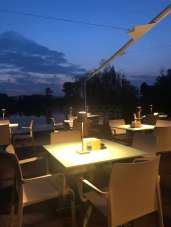 Affacciato verso il lago, il ristorante dispone di larghe vetrate verso sud e verso ovest, e di una grande patio, protetto da una tenda a vela.