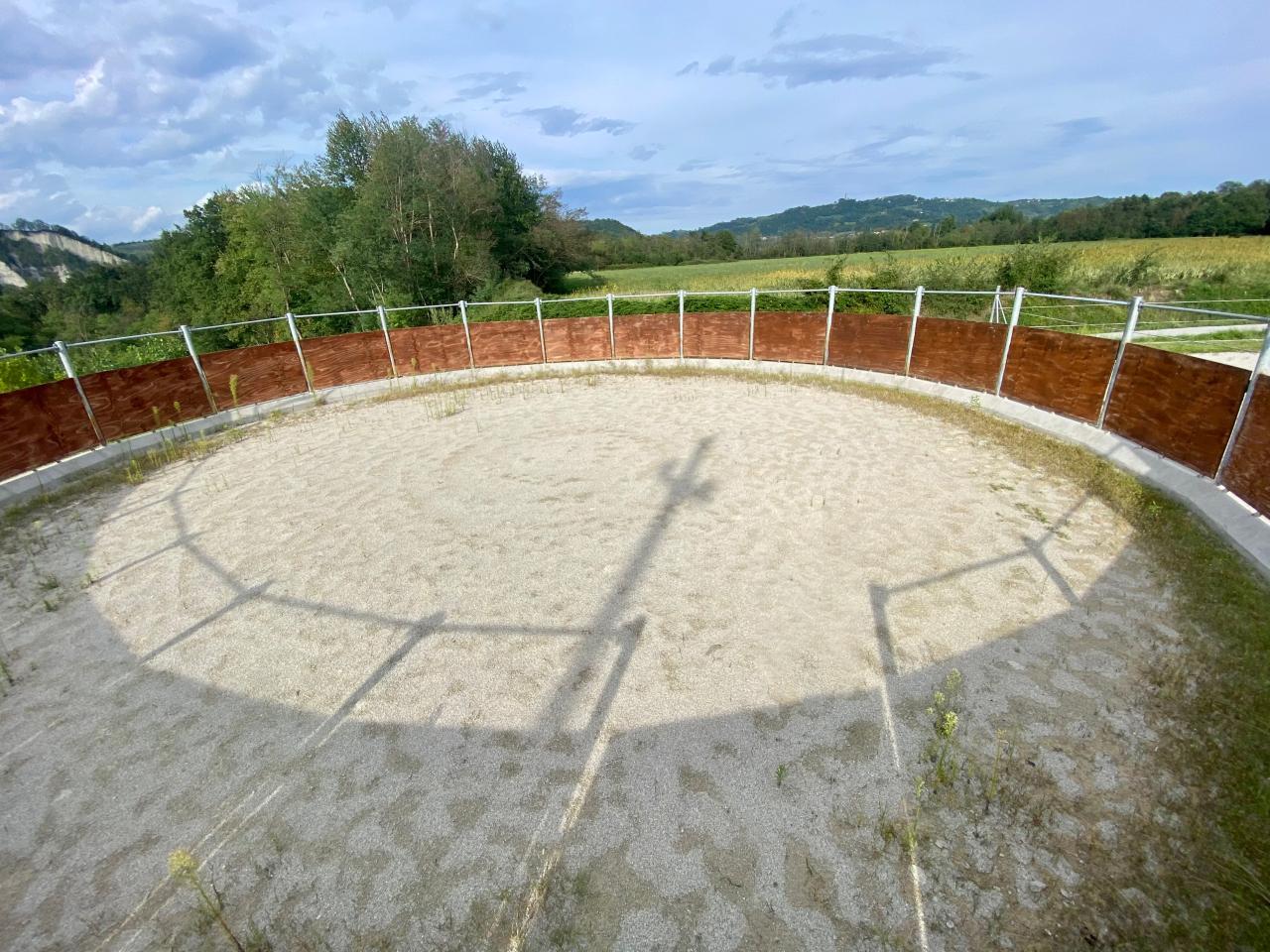 La struttura si compone di: - un fabbricato di 60 mq adibito per metà a portico coperto e per metà a box per due cavalli da cui si accede direttamente al paddock di 400 mq completamente recintato. - un fabbricato di 215 mq su due piani così disposti: due locali ad uso magazzino e bagno al piano terra e locale ampio ad uso fienile provvisto di montacarichi da 500 kg di portata per rotoballe di fieno al piano primo. - Tettoia aperta in ferro di 40 mq per ricovero attrezzi. - Lotto di terreno di circa 4.000 mq con tondino dal diametro di 16 m e campo di lavoro rettangolare di 60x 30 entrambi con fondo di sabbia.