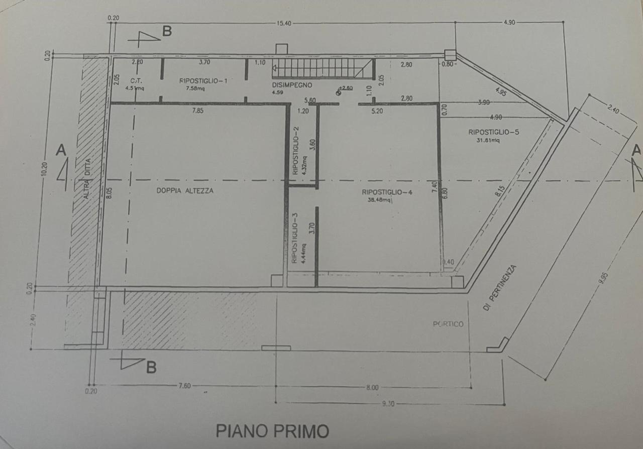 Piano primo, tramite scala, corridoio, cucinino, centrale termica, bagno, altro salone ampio/ufficio di 40 mq, due ripostigli e magazzino/ufficio.