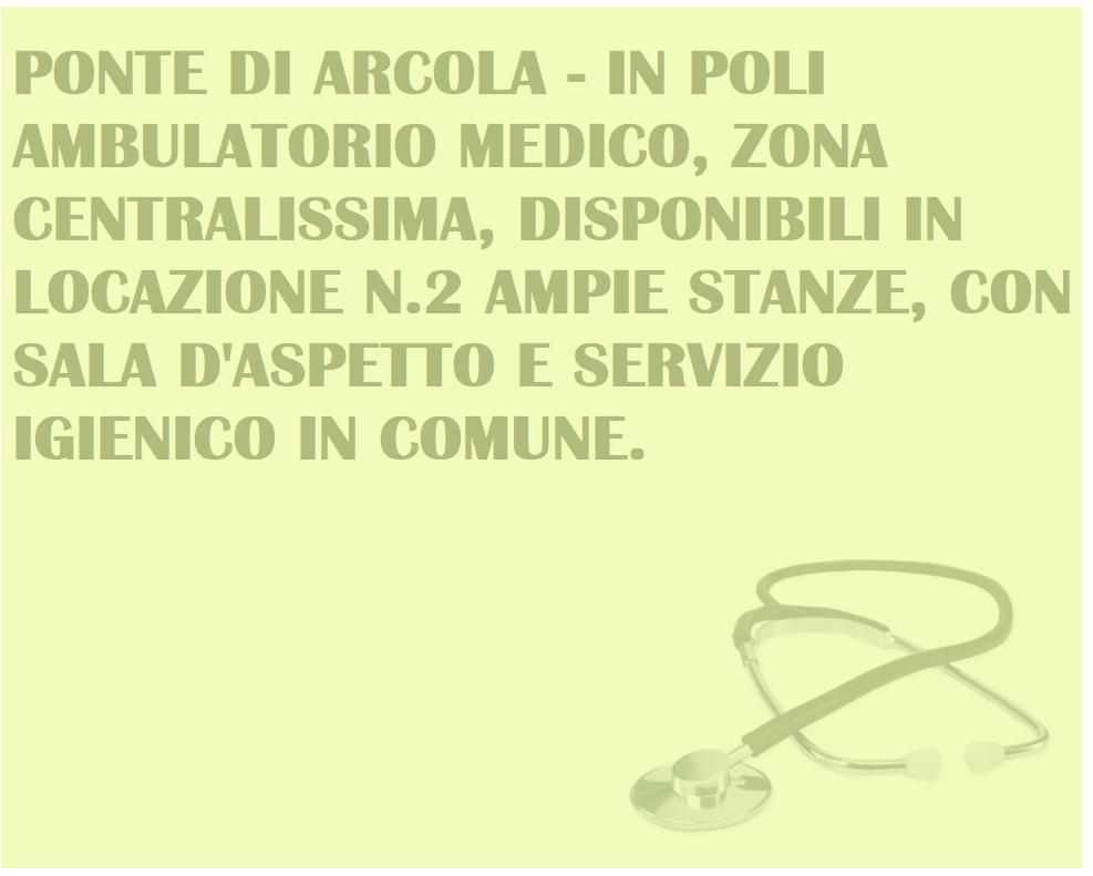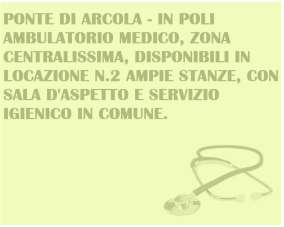 Ponte di Arcola, disponibile in appartamento adibito a studiO medico, due stanze individuali con sala d aspetto e bagno in comune agli altri ambulatori. Parcheggio a pochi passi. Piano 1° senza ascensore.Centralissimo. €300,00 per ogni studio.
