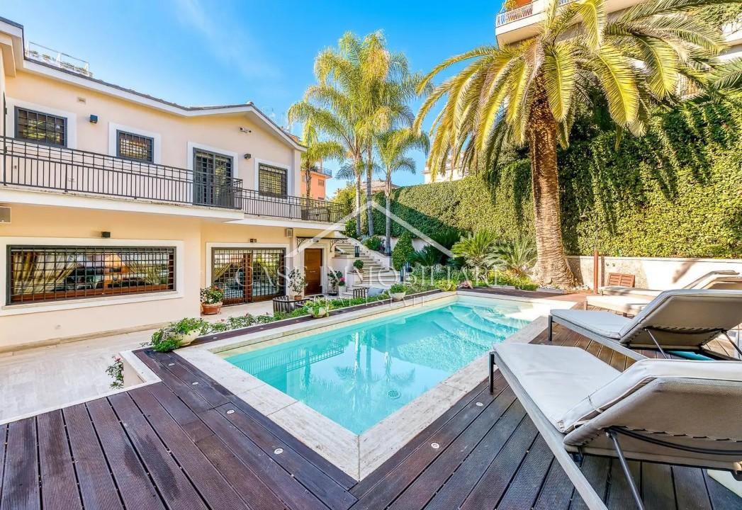 La CaSe Immobiliare VENDE, una prestigiosa VILLA UNIFAMILIARE, unica nel suo genere, sia per il tipo di costruzione, che per l´ubicazione.\nLa casa è nel cuore del quartiere Fleming, a Roma Nord, ove è impossibile trovare qualcosa di anche lontanamente simile!\nSi sviluppa su due livelli, circondata da un giardino privato con piscina, in zona collinare ricca di verde, in un contesto residenziale e tranquillo, seppur attiguo a tutti i servizi, trasporti e negozi.\nLa splendida e ristrutturatissima villa è appartenuta in passato a Rossellini ed è stata location del film and quot;Amore Mio Aiutami and quot; con Alberto Sordi e Monica Vitti.\nLa residenza di charme gode di circa 800 mq di giardino privato e riservato perfettamente curato e una meravigliosa piscina con acqua salata e riscaldata e circondata da un gradevole solarium.\nDopo il bagno in piscina, si può accedere anche alla maxi jacuzzi, ricavata in un angolo della casa per rilassarsi, magari guardando le stelle, nelle serate estive..\nSi accede all´immobile con due ingressi indipendenti : uno principale pedonale che invita gli ospiti a percorrere una magnifica scala in pietra bianca e l´altro secondario con cancello carrabile e pedonale ed ampia possibilità di parcheggio delle auto.\nLa prestigiosa proprietà, dall´importante superficie interna di circa 350 mq, si sviluppa su due livelli e si compone nel piano giorno di un triplo salone di grande rappresentanza, con al centro un imponente camino in pietra fatto a mano e un pavimento unico, realizzato artigianalmente, con marmo nero di Carrara e quercia antica. Vi è la possibilità di separare gli ambienti attraverso porte di alta falegnameria scorrevoli a scomparsa, grazie alle quali un ala del salone può diventare una camera ospiti con bagno en suite. La cucina abitabile, con vista aperta sul giardino, è stata realizzata su misura e con la stessa ricerca di materiali del resto della casa. Infine adiacente alla cucina e con eventuale ingresso indipendente c´è la lavanderia_stireria e una camera di servizio con bagno interno.\nAl piano di sopra, nella zona notte, ci sono due camere da letto con bagno en suite, una terza camera uno studio e un terzo servizio.\nTutti i bagni della casa hanno lo stesso stile con marmo di Carrara e rubinetterie dorate.\nLe finiture di pregio, l´architettura di design, i materiali scelti ed utilizzati durante la ristrutturazione del 2013, ma soprattutto la cura dei dettagli, la quotidiana manutenzione della casa, rendono questa dimora speciale nel suo genere e di grande impatto emozionale e visivo.\nCompleta la lussuosa proprietà un´area riservata per due o tre posti auto, una cucina da esterno adiacente la piscina e un box auto di 18 mq.\nArmadiature a muro, filodiffusione esterno e interno, proiettore, caldaia condensazione sostituita da 4/5 anni fa, pompe di calore e impianto di aria condizionata.\nLe presenti informazioni e planimetrie sono meramente indicative e non costituiscono elementi contrattuali. - Maggiori Dettagli: Porta blindata, Cassaforte, Camino, Videosorveglianza
