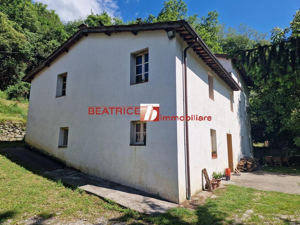 COLLINE DI LUCCA. In posizione collinare e isolata, con viabilità sterrata e sconnessa nell´ultimo km., circondata dalla vegetazione, casa colonica di 250 mq. disposta principalmente su due livelli, oltre al terzo di metratura inferiore agli altri due, restaurata nel 2000 in modo conservativo, mantenendo travi e mezzane, cotto antico, caminetti e forno originali. Composta al piano terra da ingresso-disimpegno centrale, soggiorno con camino, cucina-pranzo con camino, ampia stanza finestrata lavanderia/ripostiglio (dove è possibile realizzare un bagno); al piano primo, quattro camere (di cui una molto grande) e bagno; piano secondo, ampia camera e bagno. Corredata da ripostiglio e stanza caldaia al piano terra accessibili dall´esterno, tettoia con forno, capanna su due livelli di circa mq. 85 vicino all´abitazione e da circa 23.000 mq di terreno prevalentemente boschivo e scosceso. Classe energetica G. Ipe 280. kWh/mq. anno. L´indirizzo indicato nell´annuncio non è reale ma indicativo della zona.