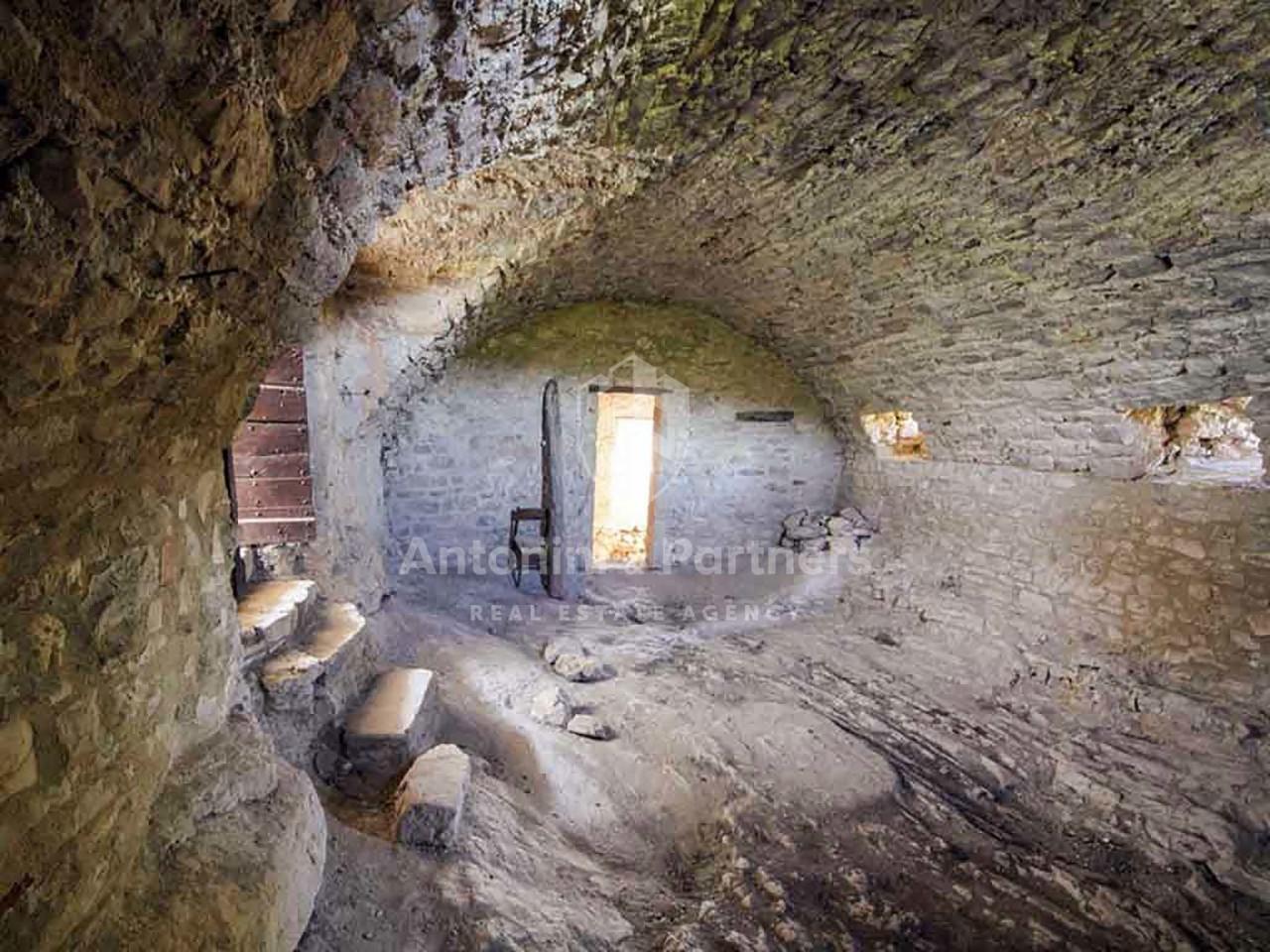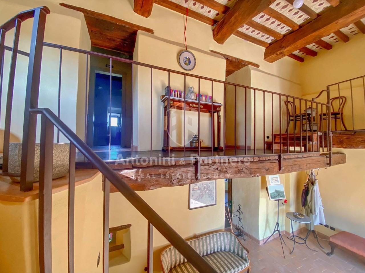 - Il piano primo è introdotto da un ampio ingresso a doppia altezza con ballatoio, bassorilievo storico e soffitto affrescato del 1769. Dispone di una cucina ampia e panoramica, con soffitti in legno, acquaio e camino. Vanta un bel soggiorno con feritoie d´arma bianca e un ampio salone nobile con camino. Lo studio, il disimpegno e servizi completano il piano.