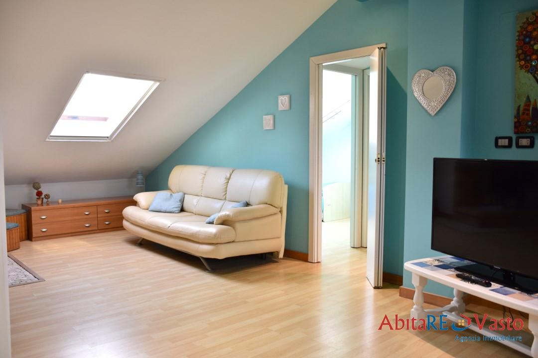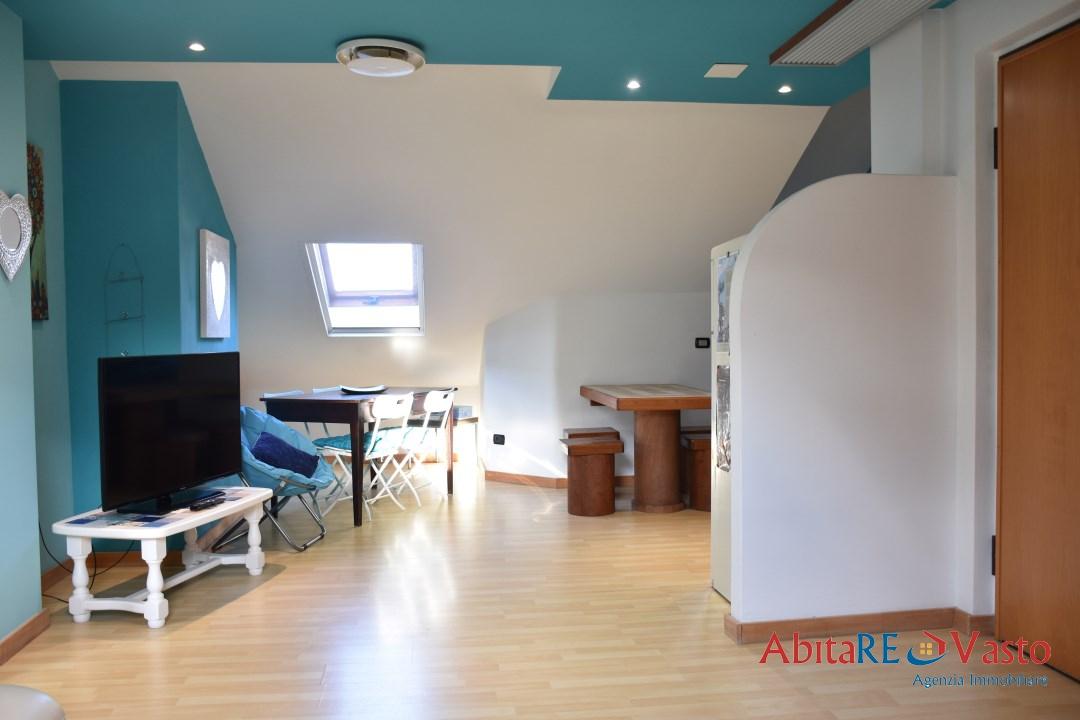 Vasto marina, Strada Statale 16 sud. All´interno di una palazzina di recente costruzione, interamente recintata ed accessibile mediante cancello automatico, proponiamo in vendita esclusiva una mansarda (già arredata), ottimamente rifinita di circa 70 mq, interamente calpestabile e così composta: ingresso in ampia e luminosa zona giorno, con camino funzionante, angolo cucina in muratura e piccolo ripostiglio; la zona notte si compone di 2 camere da letto, una matrimoniale ed una doppia, un bagno con box doccia e secondo ripostiglio. Immobile ristrutturato integralmente nel 2008, termo - autonomo e climatizzato. La proprietà si completa con 1 posto auto riservato nell´area condominiale. Immobile già libero, in perfette condizioni. - Maggiori Dettagli: Climatizzato, Ripostiglio, Vista Mare, Rete ADSL, Camino, Porta blindata