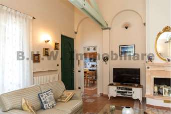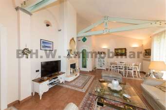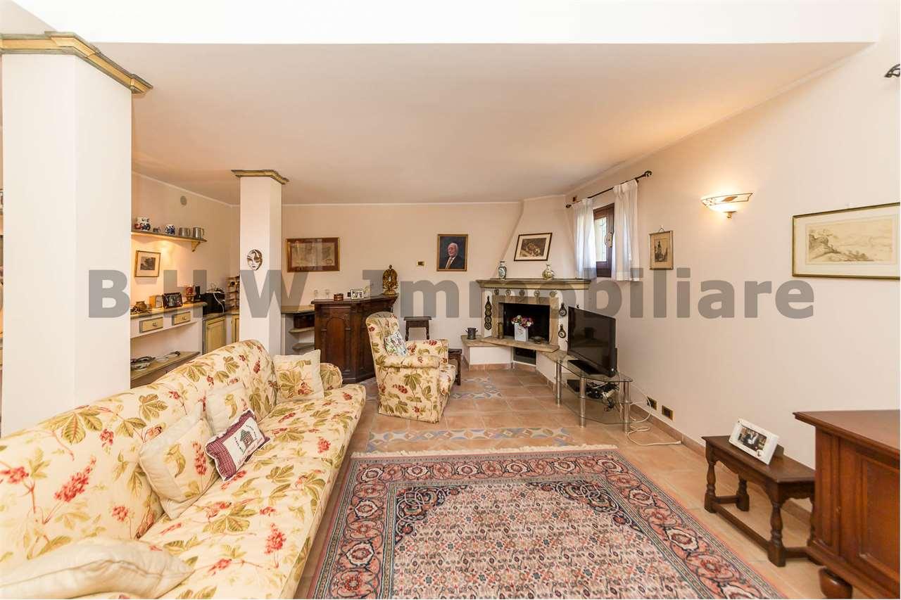 in un salone molto grande con zona relax e zona pranzo con un camino. La pavimentazione è in ceramica con delle greche molto particolari. Dall´ ingresso a sinistra si entra in una cucina abitabile, con la stessa pavimentazione. Con tre gradini si raggiunge la zona notte, con una porta con vetro Tiffany, zona pavimentata con parquet, tranne i bagni. Si compone da due ampie camere da letto matrimoniali, un bagno con vasca e il secondo bagno con doccia. Dal secondo bagno si esce sul balcone. Sempre con una bella porta stile Tiffany si raggiunge il piano seminterrato che è composto da una grande taverna con camino, una lavanderia, un ampio locale multiuso, un locale caldaia, un bagno con doccia e un ampio box con accesso diretto in casa.
