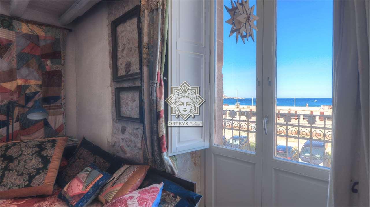 Questo appartamento al primo piano dispone di un confortevole soggiorno, di una camera da letto, di una cucina, di una locale bagno rinnovato con doccia e di una altra stanza utilizzata come camera studio, al piano superiore un´altra camera con accesso ad uno dei due terrazzi vista mare, salendo di un ulteriore livello altre due camere, un ulteriore bagno e il terrazzo dal quale è possibile godere a pieno della vista mare diretta potendo anche osservare l´intera zona denominata riviera della città di Siracusa che insieme all´isola di Ortigia abbracciano idealmente uno dei due porti marittimi ben visibile. Questa casa sorge su uno dei due storici arsenali di epoca greca riscoperti di recenti durante i lavori della nuova rete fognaria qualche anno fa.