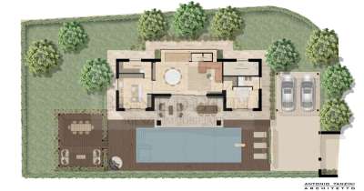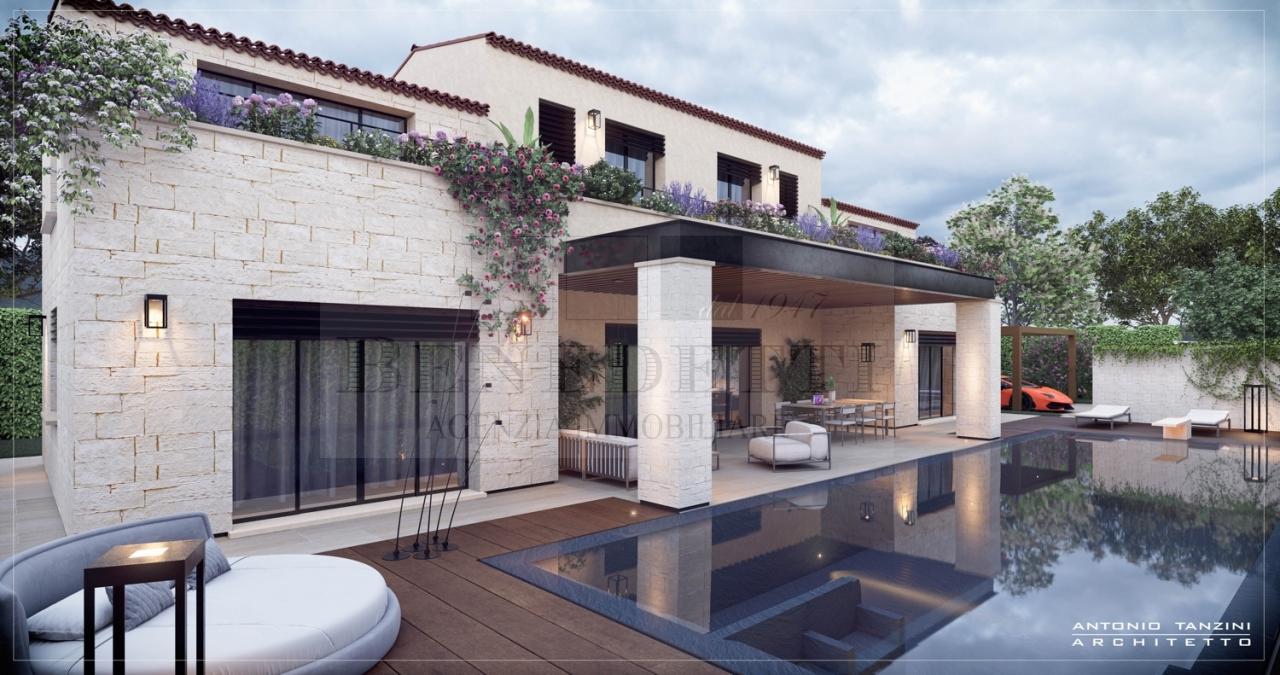 Marina di Pietrasanta, Versilia, località Fiumetto; primissime adiacenze dello splendido Parco della Versiliana, nuovissima ed elegante realizzazione di villa singola con piscina con giardino privato a corredo di circa 1000 mq. La villa presenta uno sviluppo su due livveli fuori terra; a piano terra nel corpo centrale si trovano un ampio soggiorno con zona pranzo vista piscina, all´estremità lato mare è collocata un´ampia cucina con isola e una lavanderia, mentre nell´ala lato monte si ricava una camera matrimoniale con bagno e una centrale termica. Si accede al piano primo grazie a una scala centrale aperta sul soggiorno e contenuta in una struttura realizzata completamente in ferro e vetro da piano terra a piano primo che regala un´ampia e piacevole visione sul giardino retrostante. Percorsa la scala e arrivati al primo piano ci troviamo su un ballatoio che gode della medesima vista e della luce indiretta che viene da Nord. A questo piano si trova una camera matrimoniale con bagno privato, cabina armadio e balcone esterno oltre a due ampi vani sottotetto.