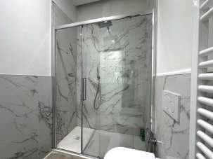 - Elegante bagno con doccia in stile moderno, rivestito in marmo;