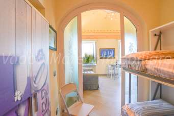 L’alloggio si trova al secondo piano (senza ascensore) e offre ambienti ampi e luminosi: l’ingresso si apre su una spaziosa zona giorno con cucina a vista, dotata di divano letto e letto a castello collocato all’interno di un locale con porta a vetri per garantire maggiore privacy.