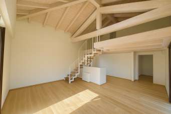 Al primo livello troviamo un ampio e luminoso soggiorno con angolo cottura caratterizzato da soffitti alti, un disimpegno, una camera matrimoniale, una camera ampia e polivalente (studio, stanza ospiti, sala hobby) e un bagno finestrato.