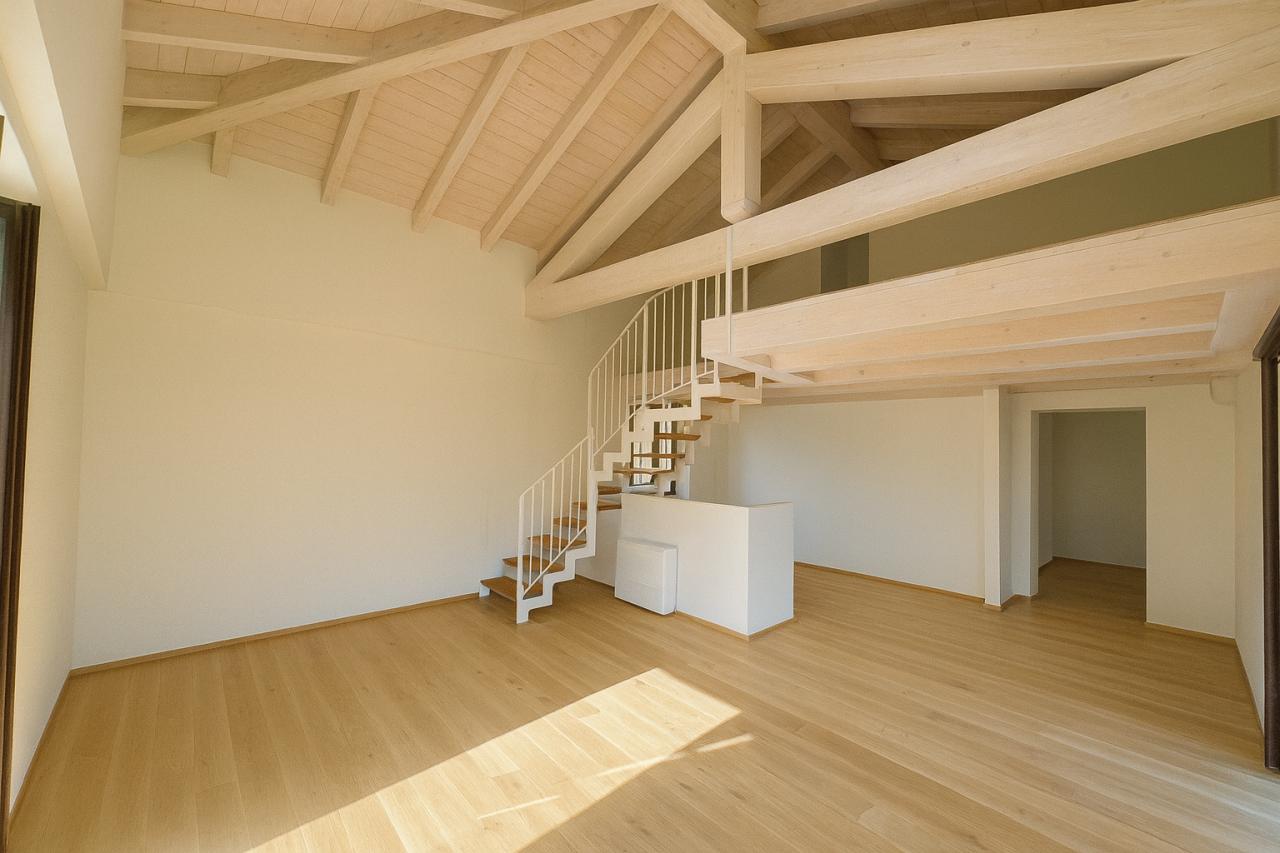 Al livello superiore, un elegante soppalco in legno che copre ¾ della superficie, ospita una seconda camera matrimoniale e un bagno aggiuntivo, creando uno spazio intimo e versatile.