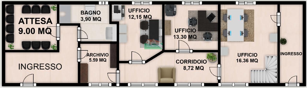 ZONA SAN MAMA: Ufficio al piano rialzato con mansarda costituito da doppio ingresso, ampia sala d´attesa, bagno finestra, stanza archivio, disimpegno con tre vani ,riscaldamento autonomo, aria condizionata, garage al piano terra RICHIESTA € 1200,00 MENSILI.