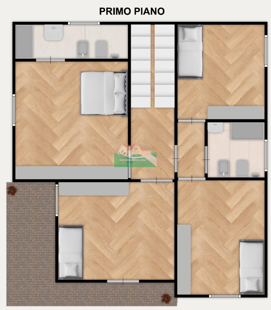 all´interno si compone da ingresso, ampia sala, sala da pranzo , cucina abitabile, bagno finestrato con box doccia, ripostiglio ove è collocata la caldaia, lavanderia, studio. Al primo piano si compone di 4 camere da letto (matrimoniale, due singole, e una doppia). al secondo piano è presente ampia mansarda con altezza massima 2,20.