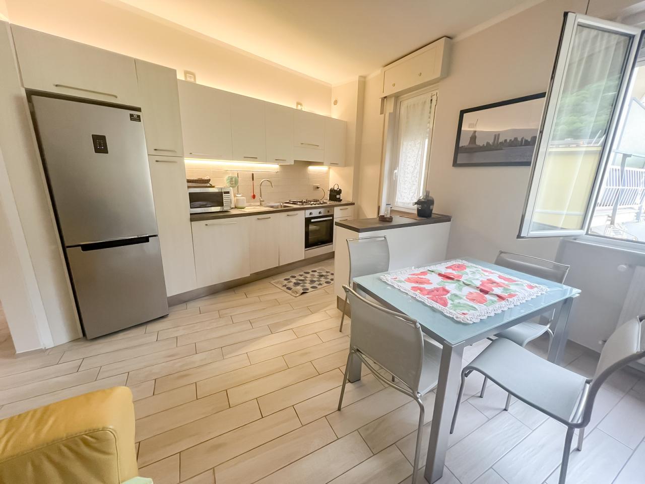 Bogliasco, Via Sessarego (Parte iniziale) Appartamento di 5,5 vani completamente ristrutturato così composto: ingresso, ampio soggiorno con cucina a vista, 2 camere da letto, un bagno con doccia, un balcone. L´immobile è stato recentemente oggetto di una totale ristrutturazione, gli impianti sono a norma e certificati, finestre in PVC doppio vetro, porta blindata e aria condizionata. I pavimenti sono in gress porcellanato con effetto parquet, le porte interne sono della Garofalo. Il riscaldamento è centralizzato e le spese sono di 100€ mensili