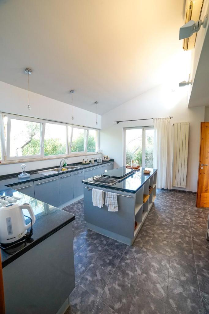 • Zona Giorno: Ingresso su saletta, ampio e luminosissimo salone open space di circa 200 mq con tetto a capriate in legno e patio antistante con vista mare. Corridoio che conduce alla cucina abitabile con isola, fuochi, griglia, lavanderia e ripostiglio.
