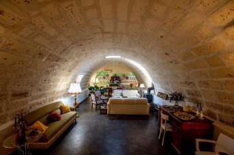 - Salone di 65 mq in pietra caratterizzato da un soffitto a volta e realizzato in quella che era la vecchia cisterna di raccolta delle acque piovane;